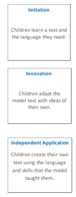 This powerful approach enables children to imitate the language they need for a particular topic orally before reading and analysing it and then writing their own version. It is built on three stages of teaching: