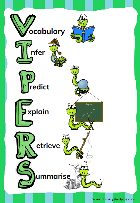 We use the VIPERS Question Stems from Literacy Shed, linked to Spelling Shed, alongside a variety of text extracts collected from resources such as cracking comprehension.